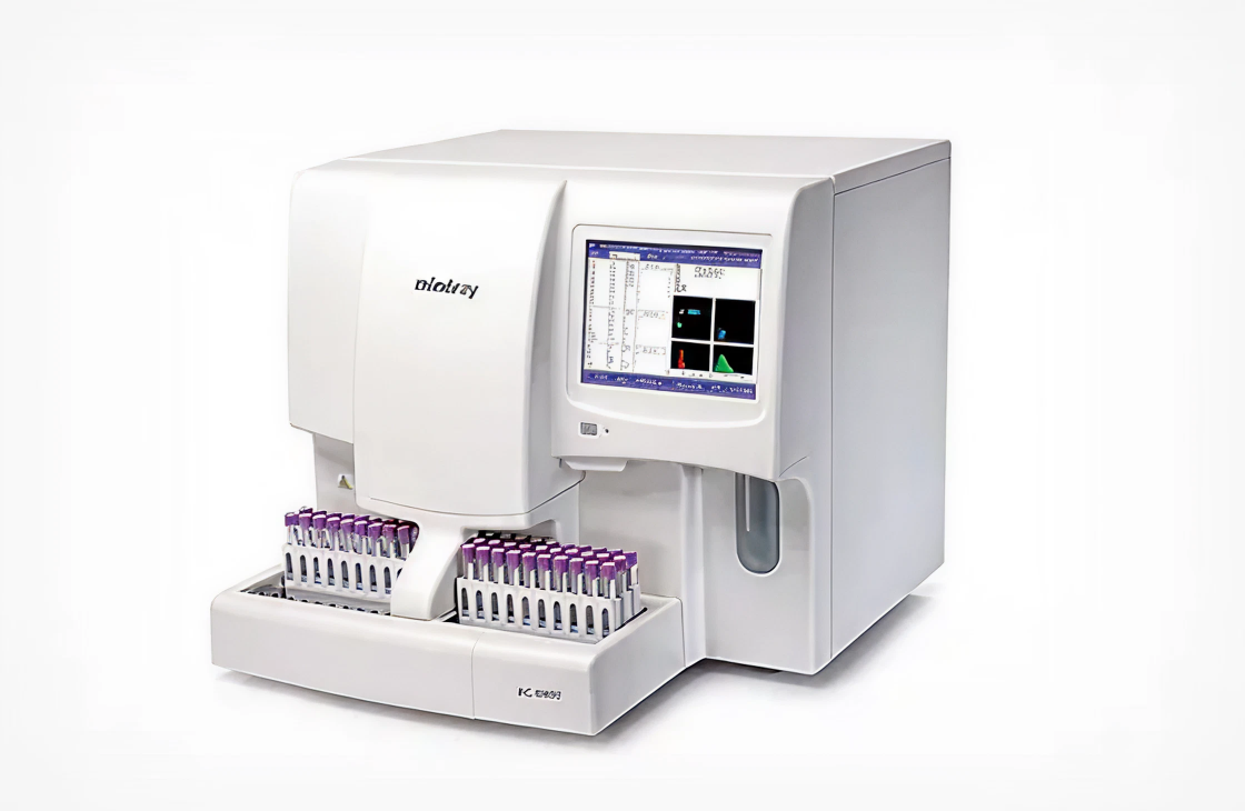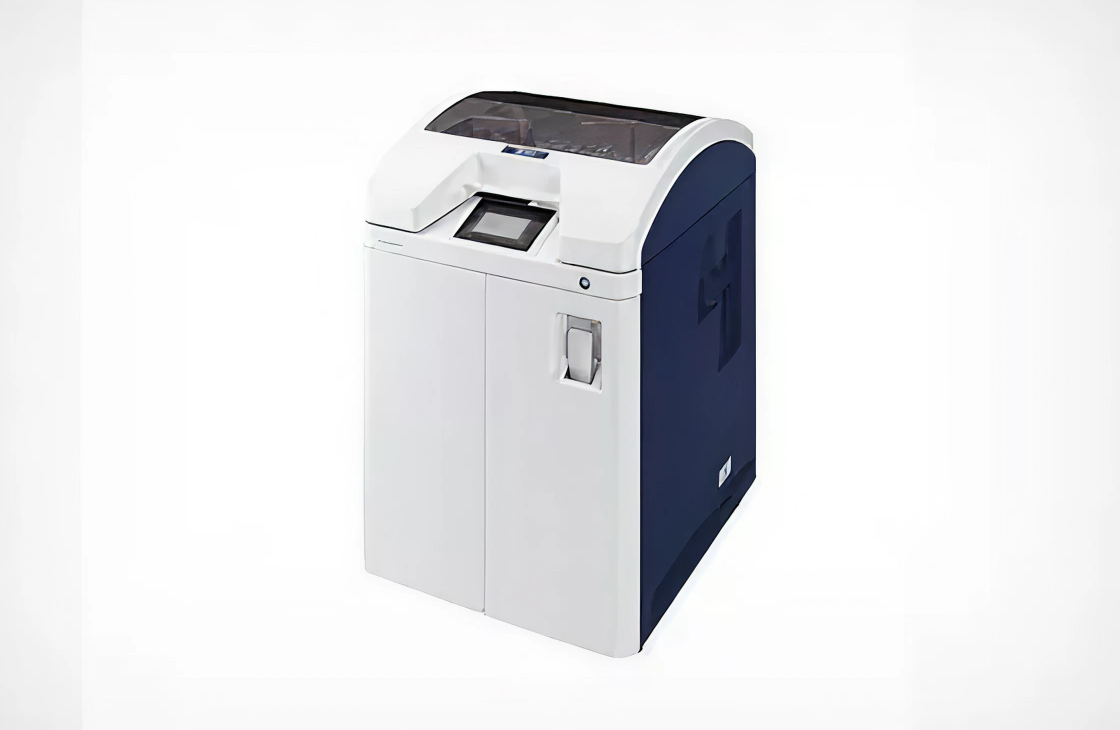1일 100개의 검체 처리능력을 가진 백업용 자동생화학분석기 무작위, 연속검사, 전자동 생화학 분석장비 자동으로 각 부위의 동작상태, 반응 온도, 광고계의 상태, 반응 큐벳의 상태 점검, 검체에 대한 용혈, 황달 및 혼탁 상태를 자동으로 감지하는 혈청정보 기능